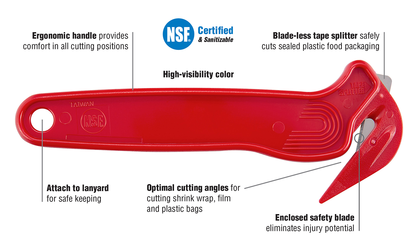 Easy to clean and sanitize, these safety cutters feature a stainless steel blade and are an ideal choice for cutting cryovac, plastic bags, shrink wrap, and paper bags.